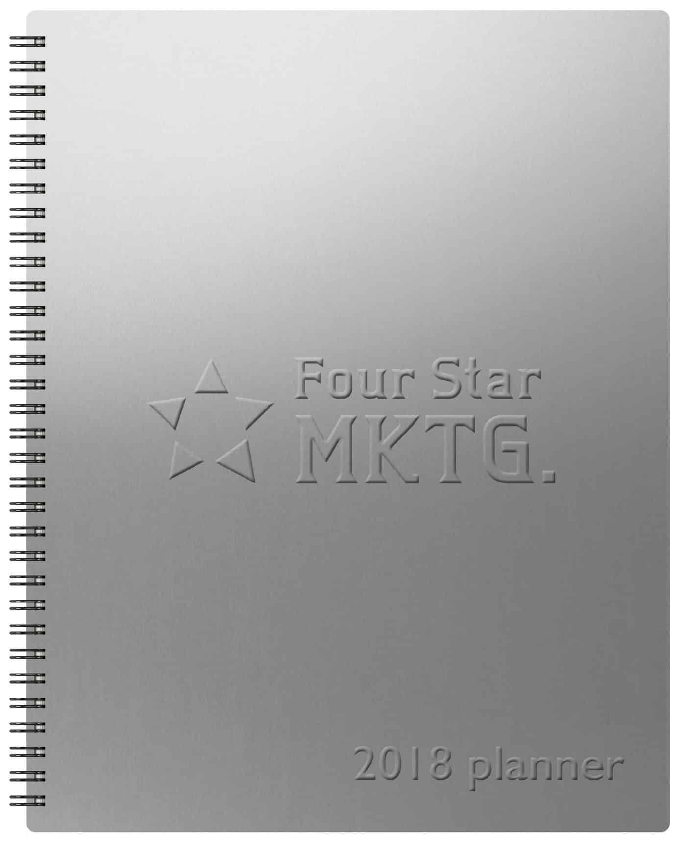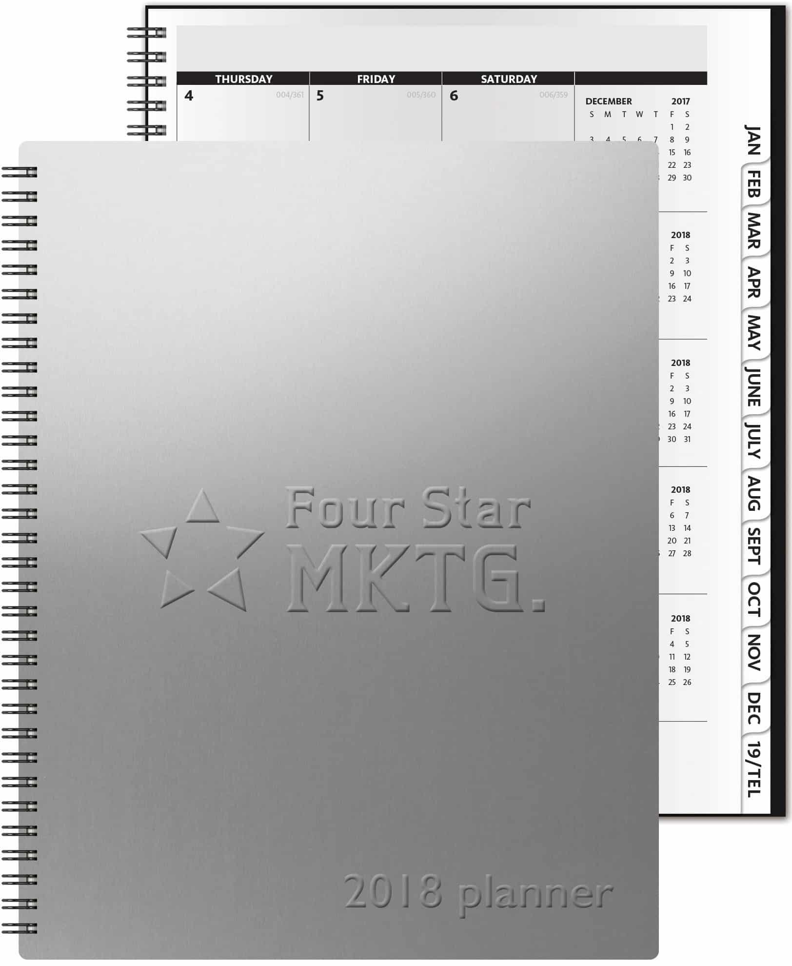 Vertical Monthly Planner…As our most popular planner, the Analyst boasts large date blocks for easy organization and die-cut tabs for quick reference to make this the ideal planning tool for fast, efficient date keeping. It features 32 pages (14 months), full year-in-view, 4-year planning spreads, area code map, contact page, and 15 blank memo sheets in back. Silver alloy front cover, a black chipboard back cover, a one-location embossed imprint and pewter wire binding. Optional PenPort & Pen. Complies with FSC. 8.5″ W x 11″ H