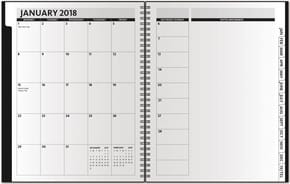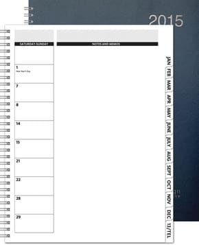 Vertical Monthly Planner…TheDirectorâ„¢ Calendar offers spacious date blocks and an extensive note and memo space. Your clients will have room to lay out each day’s tasks in detail. Features include die-cut tabs for quick reference, 32 pages (14 months), full year-in-view, 4-year planning spread, area code map, contact page, and 15 blank memo sheets in back. 2-part (front & back) leatherette cover, one-color/location foil imprint and black wire binding. Optional PenPort & Pen. Made in the USA. Complies with FSC. 8.5″ W x 11″ H