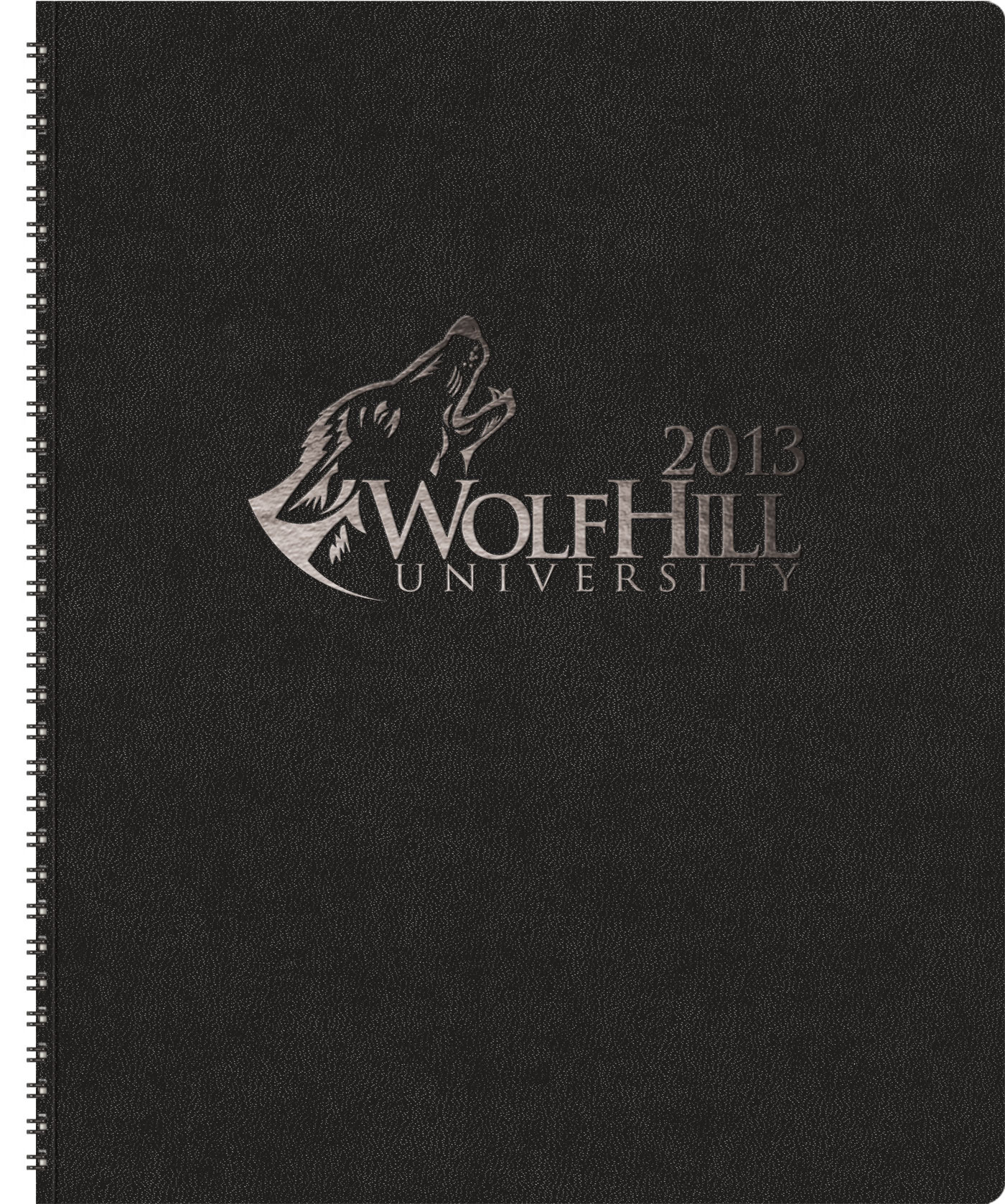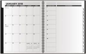 Vertical Monthly Planner…TheDirectorâ„¢ offers spacious date blocks and an extensive note and memo space. Your clients will have room to lay out each day’s tasks in detail. Features include die-cut tabs for quick reference, 32 pages (14 months), full year-in-view, 4-year planning spread, area code map, contact page, and 15 blank memo sheets in back. This version has a wraparound leatherette cover to conceal the wire, one-color/location foil imprint and black binding wire. Made in the USA. Complies with FSC. 8.5″ W x 11″ H